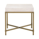 This end table features a transitional design with a casual style to give your home an elegant look. Constructed of metal and resin, this end table features an unmatched design with a sturdy look. The table top consists square pattern white finish resin where the straight metal feet with crossed design is giving it a greatest strength. The flat table top can be used to keep table lamps, decorative vases, photo frames, and more to serve its purpose to the most. Use this end table with any color or theme furniture to complement the setting.
