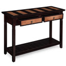 Give your living space some new life with the addition of this stylish transitional style console table. Durably constructed from wood and medium density fiberboard frame, this side table features two drawers with pull handles. It also comes with colorful storage shelf at the top and a shelf at the bottom which offers plenty of space to keep your newspapers, magazines, decorative products or other small items within your reach. It features visible wooden detailing and finished with elegant shades of brown color. This table features with sturdy block legs and adjustable floor protectors that are included to protect your floor from all kind of scratches and dents.