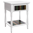 An quality product that can change the whole complexion of the place it has been put in. This kind of stylish side tables are likely to show up for every moment possible. It is made of wood with an unique design and white color finish, it comes with durable solid wood turned legs with adjustable feet and multi color boards that form up an effective storage space accented with a colorful drawer for keeping the extra accessories or small things in it.The table is truly one of a kind and can be used in your living space to keep decorative items, placing remotes and beverages while the bottom shelf provides great storage to magazines, books and other related items.