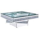 Blending modern design with a hint of glam appeal, this Coffee Table lends a contemporary appeal to any living room ensemble. Its three boxy tiers are stacked atop one another, with each being supported by a Composite Wood frame. The sides of the tiers are inset with beveled mirrored panels and dusted with crushed clear faux crystals Inlay that wink and twinkle in the available light. Beveled clear glass panels come inset in the top and they showcase a triangular pattern. Add this coffee table to your living room to create a striking look and provide you with a spot to hold your drink, books or decors. Note: Other featured items in image except this coffee table are sold separately.