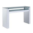 Blending modern design with a hint of glam appeal, this Sofa Table will lend a contemporary appeal to any living room ensemble. The frame of this table is built with Composite Wood and it is covered in reflective mirrored panels. The tabletop itself is made from clear tempered glass along with its one shelves underneath. The upper interior of the shelf comes studded with faux crystals and it provides elegance to its overall look. Use this table to display flowers, decorative pieces, pictures, and even books in your living room or place it right by the front door so you can handily drop your keys at the end of a long day. Note: Other featured items in image except this sofa table are sold separately.