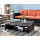 With its two-tone finish of Gray and black, this classically styled Coffee Table brings functional elegance to your living space with its double-drawer design and full-length bottom shelf. Its black metal drawer pulls brim with contemporary chic appeal, while its storage options enhance the organization. Add it to the living room of your home to store household odds and ends and use its bottom shelf to keep magazines, books, or newspapers neatly stowed.