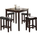 Contemporary furniture reflects designs that are current or en vogue. Grab this counter height set to enrich the look of your home decor. Crafted from wood , this brown pack of counter height table features faux marble top and four saddle stools feature polyurethane upholstered seat that will fit perfectly in any corner of the house. Other items in the image are sold separately.