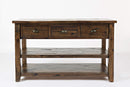 This interactive multi-space sofa table combines fun and functional storage space for modern looking homes. Made up of wood, finishes in dakota oak(brown) color, this sofa table features three drawers with cut-out handles, and two open shelves with flat top surface. This can be used to store all knick-knacks or to display decorative accents on it. The storage drawers and open beneath shelves can store a lot. This sofa table is not just a table, many more convenient adjustments you can make with this elegant furniture piece. Drawer Dimensions: 10.5"W x 13.25"D x 4"H. Shelf Dimensions: 47.25"W x 16.25"D x 7.5"H.