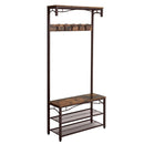 Bring this coat rack to eliminate the stacks of clothes and scattered shoes in your living room. Sturdily constructed with the combination of Metal and MDF, this rack features a built in wooden bench which provides seat when you remove shoes and can be used to keep handbags, backpacks or storage baskets. It also has two wire meshed spacious shelves for holding your daily or mostly used shoes, and has five dual hooks for hanging your keys, umbrellas, coats, hats or scarves. Place this coat rack in your hallway or near to entryway for more easy access to your frequently used and necessary items. Also, it comes with the floor protectors that can prevent scratches on the floor and also can be adjusted to provide stability in the case of uneven floors.