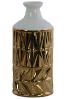 This large ceramic round vase with short neck offer modern interior to your home. This is perfect keeper if you like elegance at the corner of your rooms or your side tables. It can be used as artificial pots, flower vase and earthen pots. Fine detailing of embossed cross pattern design with white banded rimmed top and glossy chrome gold finish enhances the beauty of this vase.