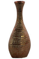 Ceramic Trumpet Mouth Bellied Oval Long Neck Vase In Ribbed Distressed Copper Finish