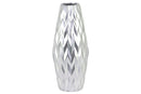 Eccentric and eye catchy this vase is full of glitz and glam, well suited for any glamourous decor this vase has been crafted and molded beautifully in ceramic. It flaunts a round shaped body with round zigzag lips. The entire surface has embossed wave design to create a decorous appeal. The bottom of the vase is slightly tapered and round in shape. Astounding art work, it is accented with matte silver finish lending a trendy style quotient to your interiors.