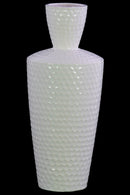 With a unique silhouette, this chic and fashioned ceramic vase features a trumpet neck and round shape with tapered bottom. The vase has been engraved with a intriguing honeycomb or diamond like designing on a glossy white finish. With a strong presentable structure this vase is a decorative to adorn with or without flowers. It will no doubt add dimension to your decor and interiors uplifting your style statement.