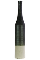 Upscale the presence of any surface with this imposingly designed vase that is shaped in a bottle like structure. Crafted from ceramic, the vase features a narrow mouth, long neck and a cream banded rim bottom. It is accented with a coated black finish.