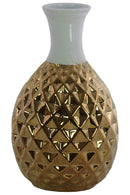 This ceramic round vase with long neck offer modern interior to your home. This is perfect keeper if you like elegance at the corner of your rooms or your side tables. It can be used as artificial pots, flower vase and earthen pots. Fine detailing of engraved diamond pattern with white banded rimmed top and glossy chrome gold finish enhances the beauty of this vase.