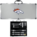 Our 8 pc BBQ set includes a spatula with knife edge, grill fork, tongs, basting brush and 4 skewers. The tools are approximately 19 inch long and have sturdy stainless steel handles. The aluminum carrying case features a metal carved Denver Broncosemblem with enameled finish.Officially licensed NFL product Licensee: Siskiyou Buckle. Heavy duty 420 grade stainless steel tools. 8 pc set includes: spatula, fork, tongs, basting brush and 4 skewers. This quality set comes in a metal team carrying case. Denver Broncos emblems on the tools and large emblem on the case