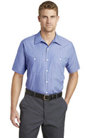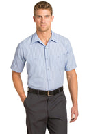 CornerStone- Short Sleeve Striped Industrial Work Shirt. CS20 Designer Notes: Durable and sharp, this work shirt can take the toughest conditions and keep employees looking great. Created to rigorous IL50 industry standards for lasting wear. Fabric/Style: 4.25-ounce, 65/35 poly/Cotton with soil release. Features open collar with stays, melamine buttons and two Pocket with pencil stall. Adult sizes: (Reg) S-6XL