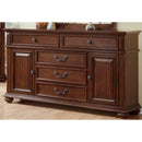 A unique spin on a traditional design, this dresser have full extension drawers with felt lining on the top drawer. It is built in wood and has an antique dark oak finish adding to its glory. This has strong designed legs to support. Does not include any featured product other than dresser. Dresser Dimensions: 18" x 65" x 41".