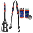 This stainless steel 2pc BBQ grill set is a tailgater's best friend. The colorful and large team graphics on each of the barbecue tools let's everyone know you are a fan! The set in includes a spatula and tongs with the Florida Gators logo. The tool set come with glass Salt & Pepper Shakers are 3.75 inches tall and the screw top lids have holes that spell out P and S.