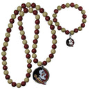 These fun and colorful Florida St. Seminoles fan bead jewelry pieces are an eyecatching way to show off your team spirit. The striking necklace is a 24 inch string of alternating team colored beads with a large team pendant. The mathcing bracelet has alternating team colored beads on a stretch cord and features a matching team charm. Officially licensed College product Licensee: Siskiyou Buckle. The team charms are fully cast metal with enameled details. The necklace is 24 inches of alternating team colored beads with a large team pendant. Bracelet beads come on a stretch cord for a comfortable fit. This fan bead jewelry set is an eyecatching Florida St. Seminoles set that any fan would love to own