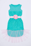Sleeveless Hi-Lo Dress with Pink Mesh Ruffle on the Bottom and Pink Flower Belt