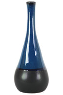 Single herbage or a bright flower is enough to showcase beauty of this vase. Made in stoneware it carries a beautiful dual finish with glossy blue on the top and black banded rim on its bottom . Its a sleek bellied round vase with small mouth and a long neck for modish appeal. Place it on any table top or mantelshelf it will upscale the beauty of that place with or without flower.