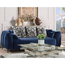 Relax and loosen up on this contemporary style sofa upholstered in blue velvet. This sofa features tight back and seat cushions and a tight high shelter backrest with high shelter arms. It features five additional pillows for additional comfort and metal spindle legs. Other featured items in image are sold separately.