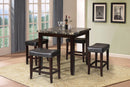 The 5 Piece Pack Counter Height Dining Set offers simplicity with a versatility perfect for any small dining space. This set boasts a contemporary space saving design, faux marble top table and four matching saddle style stools. The Table features a Faux Marble Top and tapered legs in a warm espresso finish. The Saddle Stools include Padded Polyurethane seat cushion and tapered legs complemented by 4 footrests. Knock Down Construction (Assembly Required)
