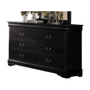 This Dresser's vintage inspired details add storage with traditional appeal to any bedroom space. Constructed of select veneers and hardwood solids in a black finish, the spacious Dresser offers six drawers for you to store your socks, tees, underwear and other foldable apparel neatly tucked away. Complete with shaped molding, bracket feet, and antique bronze color bail hardware, the Dresser has relaxed yet timeless style. Note: Other featured items in image except this Dresser are sold separately.