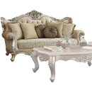 Experience a distinguished bliss of comfort with this traditional style sofa. Its rolled arms provide for a convenient support for your elbows to relax onto. It incorporates a carved crown design at the top of its headrest for added visual interest and a wingback tufted design. Upholstered in beige color, this sofa bears a wooden framework and comes with seven pillows with removable covers. Other featured items in image are sold separately.