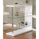 Entertain your friends in total style with this sleek contemporary bar Table. This piece features 2 glass storage shelves and a wine glass holder to store all your drink-making needs. Finished in a high gloss and detailed with chrome accents, this is a sophisticated looking piece.