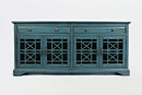 A stunning combination of color and pattern, this deliberately designed media unit will give the classic look to your living room. This features a modest design with two drawers and two cabinets. It also features beveled cabinet top and "X" motif detailing over the glass doors. Sturdily made up of wood, glass, and metal, this has finish look in antique blue color. Its sturdy and rigid structure can support a TV up to 70" in size. This media unit can be use as a server in dining area or as cabinet in halls or living room.