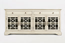 The perfect pairing of convenient storage space and beach-inspired style, this lovely Media unit is a welcome addition in any ensemble. Constructed of wood for durability and finished in antique cream tone, this media unit will blend effortlessly into your existing decor. Built to support TVs up to 70 inches, the media unit features two drawers and two cabinets with fretwork designed doors that open to reveal shelves inside to let you stow your media equipment, game consoles, and other components. The media unit can also be used near the front door to create an inviting entryway or as a buffet in your dining room.