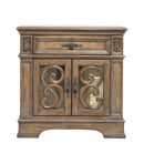 Add traditional flair to your bedroom with this Nightstand. Constructed of durable hardwood and accented with intricate carved designs, this Brown finished night stand will be a perfect companion to your bed. Featuring one drawer and a two door cabinet, this nightstand provides you a great space for storing TV remotes, books, magazines and other small items. The cabinet of this nightstand feature an ornate motif design over mirrored doors that adds further to its traditional style. Use its wide top to place a lamp for a convenient nighttime reading, and set down a glass of water for that bedtime drink. Dimensions: Width: 30.50 x Depth: 18.00 x Height: 31.75