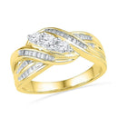 Description 10kt Yellow Gold Women's Round Baguette Diamond 3-Stone Crossover Band Ring 1/2 Cttw Gemstone Details 1/2 Carats total weight Specifications 10kt Yellow Gold Combined diamond weight of 1/2 carats total weight represents a range of 0.46 - 0.58 cts. t.w.