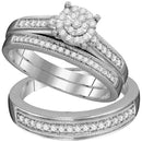 Description 10kt White Gold His & Hers Round Diamond Cluster Matching Bridal Wedding Ring Band Set 3/8 Cttw Gemstone Details 3/8 Carats total weight Specifications 10kt White Gold _Combined diamond weight of 3/8 carats total weight represents a range of 0.37 - 0.45 cts. t.w.