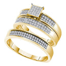 Description 10kt Yellow Gold His & Hers Round Diamond Cluster Matching Bridal Wedding Ring Band Set 1/3 Cttw Gemstone Details 1/3 Carats total weight Specifications 10kt Yellow Gold Combined diamond weight of 1/3 carats total weight represents a range of 0.30 - 0.36 cts. t.w.