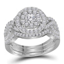 Description 14kt White Gold Women's Round Diamond Halo Bridal Wedding Engagement Ring Band Set 1-1/4 Cttw Gemstone Details 1 & 1/4 Carats total weight --- 1/4 carat center solitaire Specifications 14kt White Gold Combined diamond weight of 1 & 1/4 carats total weight represents a range of 1.23 - 1.29 cts. t.w.