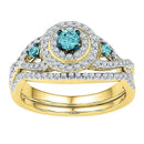 Description 5/8CTW-DIA BLUE BRIDAL SET Gemstone Details 5/8 Carats total weight --- 1/5 carat center solitaire Specifications 10kt Yellow Gold All colored diamonds are treated to permanently alter their appearance. _Combined diamond weight of 5/8 carats total weight represents a range of 0.59 - 0.70 cts. t.w.