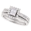 Description 14kt White Gold Women's Princess Diamond 3-Piece Halo Bridal Wedding Engagement Ring Band Set 1/2 Cttw Gemstone Details 1/2 Carats total weight Specifications 14kt White Gold Combined diamond weight of 1/2 carats total weight represents a range of 0.46 - 0.58 cts. t.w.