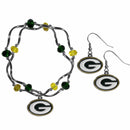 Ladies are you looking to make a fan statement? Check out this eye-catching Green Bay Packers set that includes a delicate bead bracelet and matching dangle earrings. The bracelet has 2 entwined stretch cords with helix beads separated by team colored crystal beads and fully cast metal team charms that match the team charms on the earrings. The earrings features hypoallergenic, steel fishhook posts. This designer inspired jewelry set will be the talk of the game!Officially licensed NFL product Licensee: Siskiyou Buckle. Earrings come with hypoallergenic, steel fishhook posts. Fashionable helix and crystal bead bracelet. Both trendy jewelry pieces come with a fully cast metal team charm with enameled color. Beauty and sports meet in this Green Bay Packers jewelry set