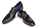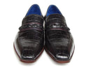 Loafers style slip-on men's shoes. Black genuine crocodile and purple hand painted calfskin upper with leather sole and blue leather lining.