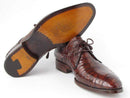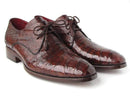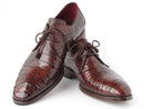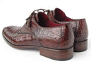Derby style men's exotic dress shoes. Full genuine crocodile upper with double leather sole and bordeaux leather lining. Leather wrapped laces with two eyelet.