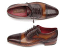 Side handsewn captoe oxford style men's handmade shoes. Brown hand painted leather upper with leather sole and bordeaux leather lining.