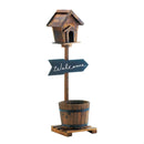 A planter, a welcome sign, and a birdhouse all in one! This incredible yard accent features rustic style that will make your outdoor space look absolutely great. It has a rustic wooden birdhouse on top, a chalkboard sign, and a metal-banded barrel planter below.