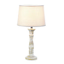 This lovely little table lamp looks like a timeworn treasure. It features a weathered base with elaborate detailing and a creamy white fabric shade.