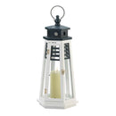 Decorate your home like a sleepy seaside village with this charming lighthouse lantern. The lantern features a pinewood frame painted white and navy blue with an iron hook at the top for easy hanging. Place a flameless pillar candle inside the lantern to illuminate your space in a soft and serene glow.