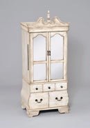 This Jewelry Armoire will be a functional and stylish addition to any bedroom. Handsomely Crafted in Antique White Finish, composed from selected woods and veneers. Features: Storage Drawers perfect to keep small items organized; the top cover opens up to reveal a hidden mirror and multiple jewelry storage compartments; two jewelry storage doors include hooks for necklaces; both top & door jewelry storage are complemented with felt lined to keep jewelry safe and protected.