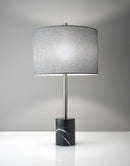 This Table lamp pairs sleek brushed steel with a chunky black marble base for a sophisticated, yet contemporary look. A tweed-like grey textured shade finishes off the look. The beauty of the Blythe collection lies in the simplicity of its design and the delicate details of the shade texture and marble grain. A 3-Way rotary switch on the socket controls light output of a 100 Watt incandescent bulb or equivalent CFL. The 3-way rotary socket switch will only work with a 3-way light bulb, otherwise this lamp will function with simple on/off switch at its highest setting. This lamp has a clear cord and is smart outlet compatible. Bulb is not included.