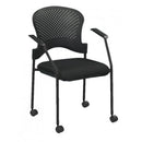 A solid black frame chair for your office and working space. You get the very definition of comfort with its aerated plastic back and well padded seat, which is upholstered in soft black fabric. The chair is supported by four legs with casters for easy pull and placement. Go ahead and sit with confidence while you get the job done. Its black finish gives your space a professional lift. Dimensions: 25" x 21" x 33.75".