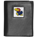 Our Kansas Jayhawks leather tri-fold wallet features a sculpted and hand painted team square on a black leather tri-fold. Includes an ID window, slots for credit cards and clear plastic photo sleeves. For a sporty feel, the liner of the wallet is made with a canvas liner. Officially licensed College product Licensee: Siskiyou Buckle. Genuine fine grain leather wallet. Ample credit card slots. Windowed ID slot. Metal Kansas Jayhawks emblem with enameled team colors