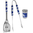 This stainless steel 2pc BBQ grill set is a tailgater's best friend. The colorful and large team graphics on each of the barbecue tools let's everyone know you are a fan! The set in includes a spatula and tongs with the Kentucky Wildcats logo. The tool set comes with a compact shaker is 2 inch tall with a twist top that closes off the holes at the top making it perfect for travel preventing those messy spills. The shaker has wide holes perfect for keeping your pepper seeds or cheese toppings.