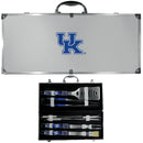 This is the ultimate Kentucky Wildcats tailgate accessory! The high quality, 420 grade stainless steel tools are durable and well-made enough to make even the pickiest grill master smile. This complete grill accessory kit includes; 4 skewers, spatula with bottle opener and serrated knife edge, basting brush, tongs and a fork. The 18 inch metal carrying case is perfect for great outdoor use making grilling an ease while camping, tailgating or while having a game day party on your patio. The tools are 17 inches long and feature vivid team graphics. The metal case features a large team emblem with exceptional detail. This high-end men's gift is sure to be a hit as a present on Father's Day or Christmas.Officially licensed College product Licensee: Siskiyou Buckle. 420 grade stainless steel BBQ set for outdoor events. Grill set includes: 4 skewers, spatula with bottle opener and serrated edge, fork and tongs. The high-quality tools make this set the perfect men's gift for Father's Day or Christmas. Each tool features vivid Kentucky Wildcats graphics and the case features a 4 inch team logo