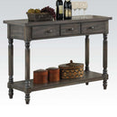 This server would be a perfect addition to your dining room with minimalistic design. Made out of wood, it has weathered gray finish which adds to its rustic appeal. The server has three drawers with wooden round knobs to keep cutlery ,canisters containing condiments, fruit baskets or other dining related items. There is a bottom shelf which acts as additional space which can be used for display and storage purpose. It has wooden turned legs giving it a classic appeal. The rectangular top of the server can be adorned with various decorative pieces.
